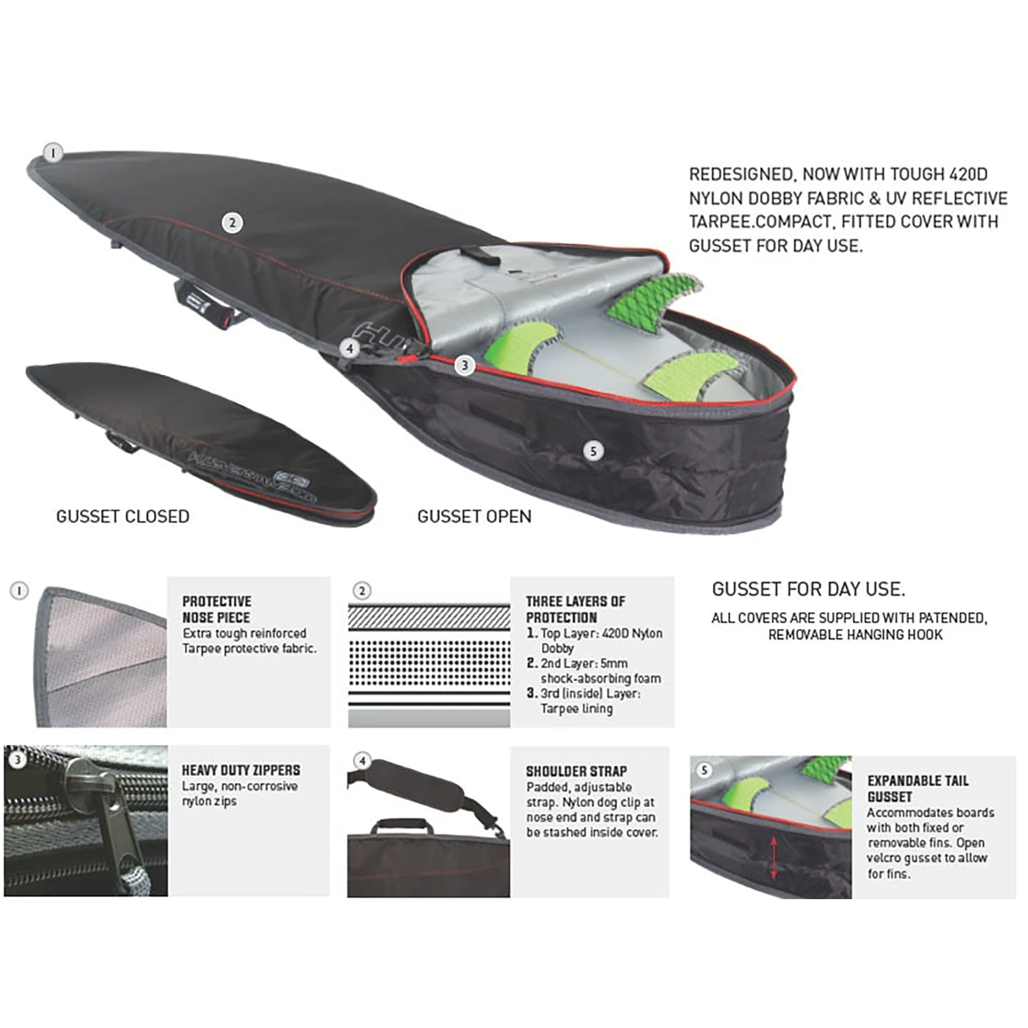 Redesigned, now with tough 420D nylon dobby fabric & UV reflective tarpee. Compact, fitted cover with gusset for day use.Expandable tail gusset: Accommodates boards with both fixed or removable fins. Open velcro gusset to allow for fins.